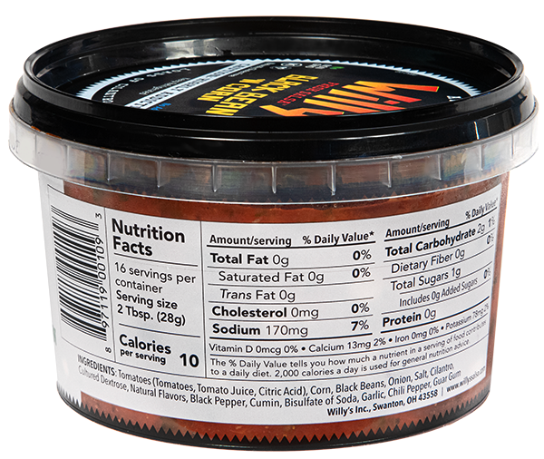 Our Black Bean 'N Corn is one of our newest recipes and we're very proud of it. We took our Willy's Fresh Original Recipe and blended in the perfect combination of Black Beans and Corn. We believe it's the best Black Bean 'N Corn Salsa in the market, give it a try!