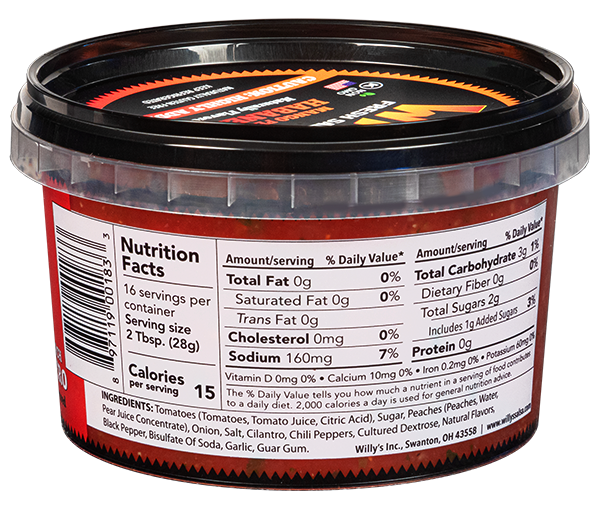 Tomatoes (Tomatoes, Tomato Juice, Citric Acid), Sugar, Peaches (Peaches, Water, Pear Juice Concentrate), Onion, Salt, Cilantro, Chili Peppers, Cultured Dextrose, Natural Flavors, Black Pepper, Bisulfate of Soda, Garlic, Guar Gum