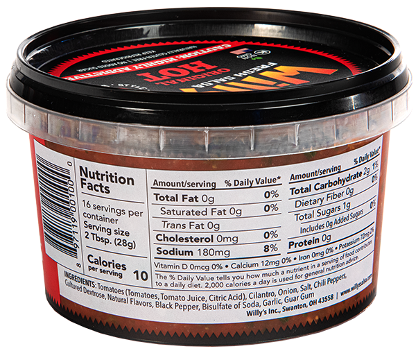Tomatoes (Tomatoes, Tomato Juice, Citric Acid), Cilantro, Onion, Salt, Chili Peppers, Cultured Dextrose, Natural Flavors, Black Pepper, Bisulfate of Soda, Garlic, Guar Gum