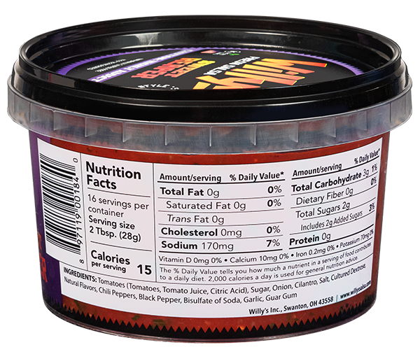 Tomatoes (Tomatoes, Tomato Juice, Citric Acid), Sugar, Onion, Cilantro, Salt, Cultured Dextrose, Natural Flavors, Chili Peppers, Black Pepper, Bisulfate of Soda, Garlic, Guar Gum